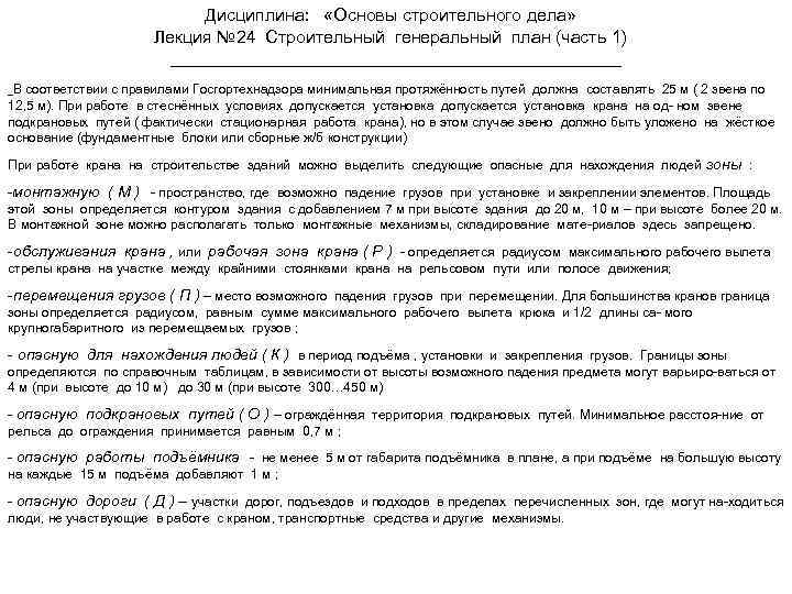 Дисциплина: «Основы строительного дела» Лекция № 24 Строительный генеральный план (часть 1) В соответствии с правилами Госгортехнадзора минимальная протяжённость путей должна составлять 25 м ( 2 звена по 12, 5 м). При работе в стеснённых условиях допускается установка крана на од- ном звене подкрановых путей ( фактически стационарная работа крана), но в этом случае звено должно быть уложено на жёсткое основание (фундаментные блоки или сборные ж/б конструкции) При работе крана на строительстве зданий можно выделить следующие опасные для нахождения людей зоны : -монтажную ( М ) - пространство, где возможно падение грузов при установке и закреплении элементов. Площадь этой зоны определяется контуром здания с добавлением 7 м при высоте здания до 20 м, 10 м – при высоте более 20 м. В монтажной зоне можно располагать только монтажные механизмы, складирование мате-риалов здесь запрещено. -обслуживания крана , или рабочая зона крана ( Р ) - определяется радиусом максимального рабочего вылета стрелы крана на участке между крайними стоянками крана на рельсовом пути или полосе движения; -перемещения грузов ( П ) – место возможного падения грузов при перемещении. Для большинства кранов граница зоны определяется радиусом, равным сумме максимального рабочего вылета крюка и 1/2 длины са- мого крупногабаритного из перемещаемых грузов ; - опасную для нахождения людей ( К ) в период подъёма , установки и закрепления грузов. Границы зоны определяются по справочным таблицам, в зависимости от высоты возможного падения предмета могут варьиро-ваться от 4 м (при высоте до 10 м) до 30 м (при высоте 300… 450 м) - опасную подкрановых путей ( О ) – ограждённая территория подкрановых путей. Минимальное расстоя-ние от рельса до ограждения принимается равным 0, 7 м ; - опасную работы подъёмника - не менее 5 м от габарита подъёмника в плане, а при подъёме на большую высоту на каждые 15 м подъёма добавляют 1 м ; - опасную дороги ( Д ) – участки дорог, подъездов и подходов в пределах перечисленных зон, где могут на-ходиться люди, не участвующие в работе с краном, транспортные средства и другие механизмы.