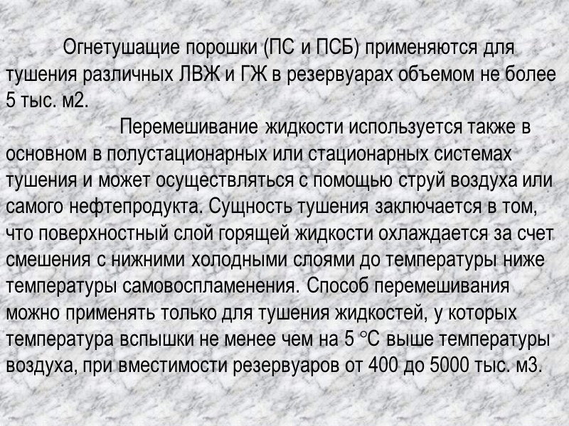 Огнетушащие порошки (ПС и ПСБ) применяются для тушения различных ЛВЖ и ГЖ в резервуарах объемом не более 5 тыс. м2. Перемешивание жидкости используется также в основном в полустационарных или стационарных системах тушения и может осуществляться с помощью струй воздуха или самого нефтепродукта. Сущность тушения заключается в том, что поверхностный слой горящей жидкости охлаждается за счет смешения с нижними холодными слоями до температуры ниже температуры самовоспламенения. Способ перемешивания можно применять только для тушения жидкостей, у которых температура вспышки не менее чем на 5 °С выше температуры воздуха, при вместимости резервуаров от 400 до 5000 тыс. м3.