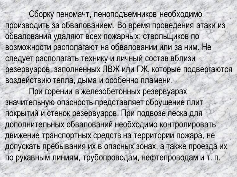 Для обеспечения условий успешного тушения пожаров в резервуарных парках хранения ЛВЖ и ГЖ в гарнизонах проводятся необходимые мероприятия: создание запасов на объектах и в гарнизонах необходимого количества пенообразующих средств, хранение нормативного запаса средств на нефтебазе (если в городе несколько нефтебаз, то пенообразующие средства могут храниться в другом месте, но доставка их должна быть обеспечена в течение часа); возможность быстрого сосредоточения необходимого количества этих средств на пожар; совершенствование тактической выучки личного состава пожарных частей и порядка сбора начальствующего состава гарнизона; разработка планов тушения пожаров.