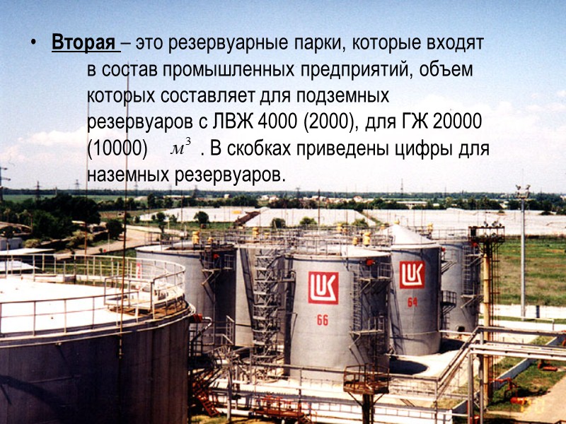 Вторая – это резервуарные парки, которые входят в состав промышленных предприятий, объем которых составляет для подземных резервуаров с ЛВЖ 4000 (2000), для ГЖ 20000 (10000) . В скобках приведены цифры для наземных резервуаров.