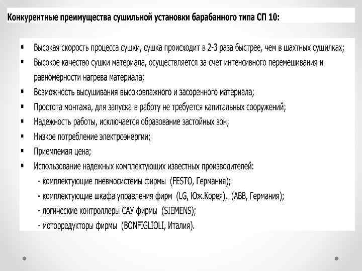 В стандартную комплектацию сушильной установки СП 10 входит: - Сушильный барабан с расширенной передней частью; - Горелочное устройство на жидком топливе; - Разгрузочная камера; - Шкаф управления.