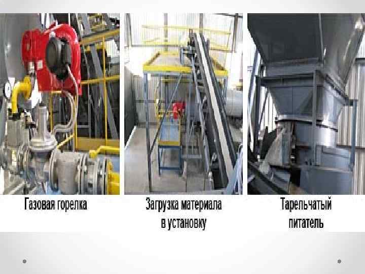 Технологический процесс сушки материалов в барабанной сушилке материал погрузчиком, грейфером или иным способом подается в емкость для сырого материала атмосфера питатель (дозатор) циклон вентилятор (дымосос) Отработанный газ ленточный транспортер (конвейер) Нагретый газ приемная воронка сушильной установки передняя часть барабана, куда одновременно подаются нагретые газы от горелки. Температура материала на выходе из разгрузочной камеры 80°С Работой всего сушильного оборудования управляет шкаф управления. Предусмотрено ручное управление. Сушильный комплекс может комплектоваться охладителем барабанного типа.