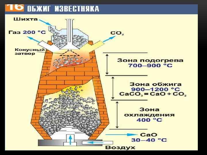 Обжиг извести, процессы, протекающие при обжиге извести. Основным процессом при производстве воздушной извести является обжиг, при котором известняк декарбонизируется и превращается в известь по следующей реакции: Са. СО 3 + 42, 52 ккал < = > Са. О + СО 2 Из этого уравнения видно, что для разложения одной грамм молекулы Са. СО 3 на Са. О и СО 2 нужно затратить 42, 52 ккал тепла, а для разложения 1 кг Са. СО 3 425, 2 ккал.