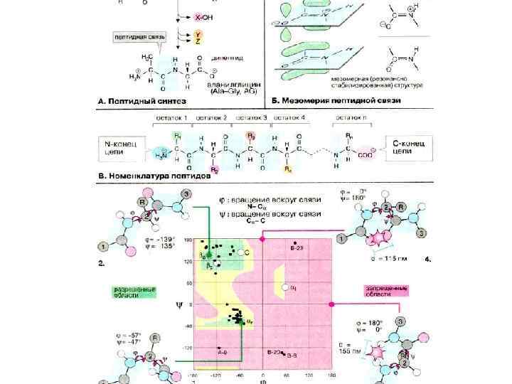 Пептидная группа относится к р-, -сопряженной системе, в составе которой атомы С, О и N образуют -связи, которые лежат в одной плоскости. За счет образования единого делокализованного 4 -электронного облака вращение вокруг С-N связи затруднено. При этом -углеродные звенья находятся в выгодном транс-положении.