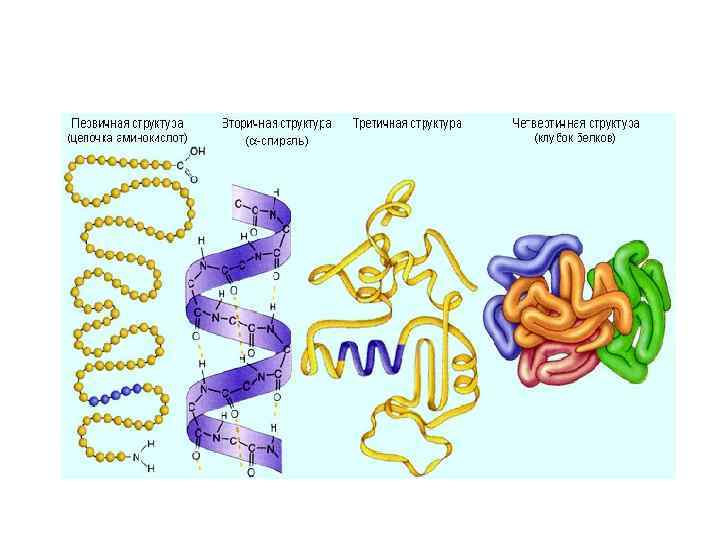 По третичной структуре белки делят на: - глобулярные - для них характерна спиральная структура, уложенная в пространстве в виде сферы – глобулы (пр. яичный белок, фермент - глобин в составе гемоглобина); -фибриллярные - для них характерна структура. Как правило, эти белки имеют волокнистое строение и к ним относятся белки мышц, ткани - миоинозин, бетта - кератин волос.