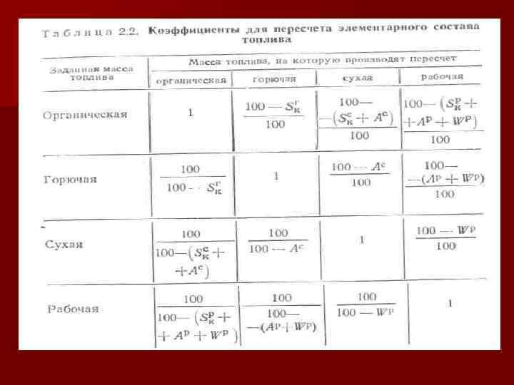 РАСЧЕТ ГОРЕНИЯ ТОПЛИВА Промышленные виды топлива горят в результате химических реакций окисления их горючей части кислородом воздуха. Поэтому первой задачей расчета горения является определение расхода воздуха на горение топлива. Затем определяют количество и состав продуктов горения — дымовых газов, образующихся в результате горения топлива и, наконец, определяют температуру дымовых газов. n Первый этап этих расчетов — определение расхода кислорода. Расход кислорода рассчитывают исходя из стехиометрических соотношений реакций окисления отдельных компонентов горючей части топлива, их атомных и молекулярных масс. Для твердого и жидкого топлив эти расчеты ведут по соотношениям массы веществ, участвующих в реакциях, а для газообразного топлива — по объемным соотношениям. Расход воздуха определяют, учитывая в нем наличие азота и водяных паров. Расход кислорода и, следовательно, расход воздуха, соответствующий точным стехиометрическим соотношениям реакций горения, является теоретически необходимым расходом воздуха. В действительности же при сжигании топлива подают в топку всегда несколько больше воздуха в сравнении с теоретическим, так как часть кислорода не успевает прореагировать с горючими частями топлива из-за несовершенства процесса смешения топлива с воздухом. n