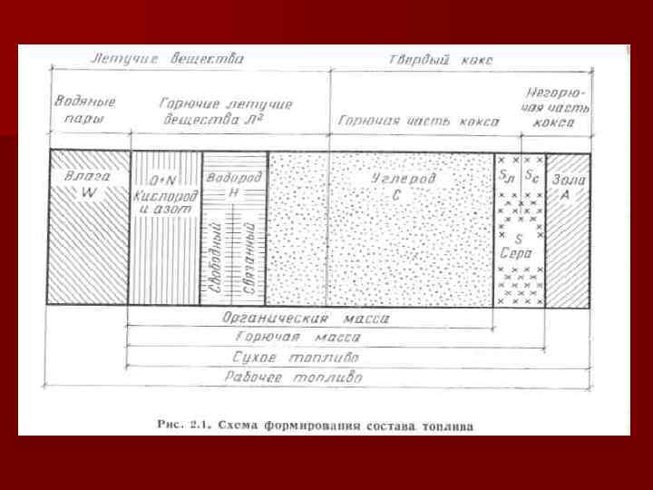 n К естественным относят те виды топлива, которые сжигают без обогащения. Механическая обработка естественного топлива: дробление, грохочение, промывка, не переводит его в разряд искусственных топлив. Последние получают из естественных путем их термической переработки, в процессе которой могут меняться их химический состав, агрегатное состояние и свойства. Общая классификация технических топлив, применяемых в промышленности, приведена в табл. 1. Отдельные составные части твердого топлива образуют его органическую, горючую, сухую и рабочую массу (рабочее топливо) В элементарный химический состав топлива входят углерод, водород, кислород, азот и сера. Кроме того, в топливе содержится влага и зола. Углерод, водород, кислород и азот образуют органическую массу топлива, а вместе с серой — горючую массу. Частично сера входит в зольную часть топлива. В составе сухой массы топлива находится горючая масса и зола, а сухая масса с влагой образуют рабочее топливо.