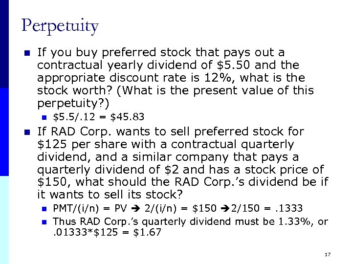 Perpetuity n If you buy preferred stock that pays out a contractual yearly dividend of $5. 50 and the appropriate discount rate is 12%, what is the stock worth? (What is the present value of this perpetuity? ) n n $5. 5/. 12 = $45. 83 If RAD Corp. wants to sell preferred stock for $125 per share with a contractual quarterly dividend, and a similar company that pays a quarterly dividend of $2 and has a stock price of $150, what should the RAD Corp. ’s dividend be if it wants to sell its stock? n n PMT/(i/n) = PV 2/(i/n) = $150 2/150 =. 1333 Thus RAD Corp. ’s quarterly dividend must be 1. 33%, or. 01333*$125 = $1. 67 17