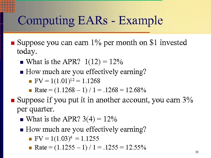 Computing EARs - Example n Suppose you can earn 1% per month on $1 invested today. What is the APR? 1(12) = 12% n How much are you effectively earning? n n FV = 1(1. 01)12 = 1. 1268 Rate = (1. 1268 – 1) / 1 =. 1268 = 12. 68% Suppose if you put it in another account, you earn 3% per quarter. What is the APR? 3(4) = 12% n How much are you effectively earning? n n n FV = 1(1. 03)4 = 1. 1255 Rate = (1. 1255 – 1) / 1 =. 1255 = 12. 55% 23