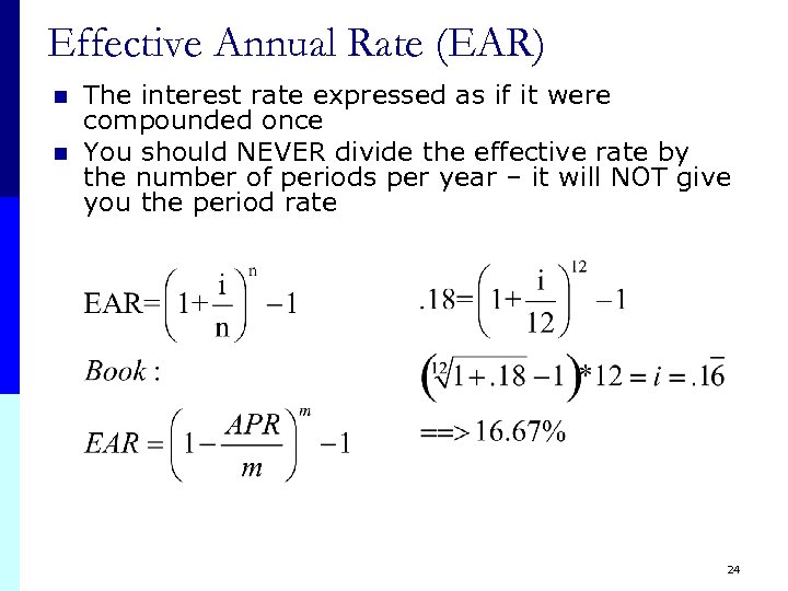 Effective Annual Rate (EAR) n n The interest rate expressed as if it were compounded once You should NEVER divide the effective rate by the number of periods per year – it will NOT give you the period rate 24