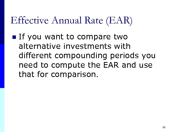 Effective Annual Rate (EAR) n n One compounding period per year: n APR = EAR When number of compounding periods per year goes up, EAR goes up, but up to a limit 365 periods per year is near the limit n Limit of EAR = ei n n EAR n e. 12 n = (1+. 12/365)365 -1 =. 127474614 =. 127496852 e 2. 71828 25