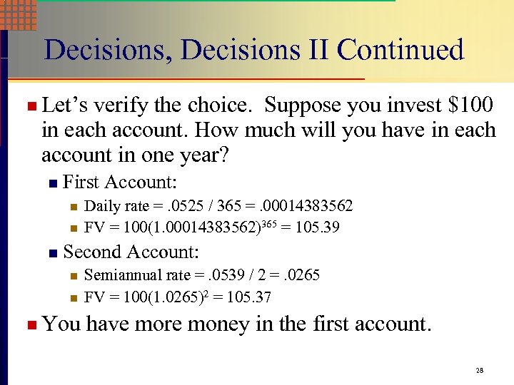 Decisions, Decisions II n You are looking at two savings accounts. One pays 5. 25%, with daily compounding. The other pays 5. 3% with semiannual compounding. Which account should you use? n First account: n n EAR = (1 +. 0525/365)365 – 1 = 5. 39% Second account: n EAR = (1 +. 053/2)2 – 1 = 5. 37% n Which account should you choose and why? 27