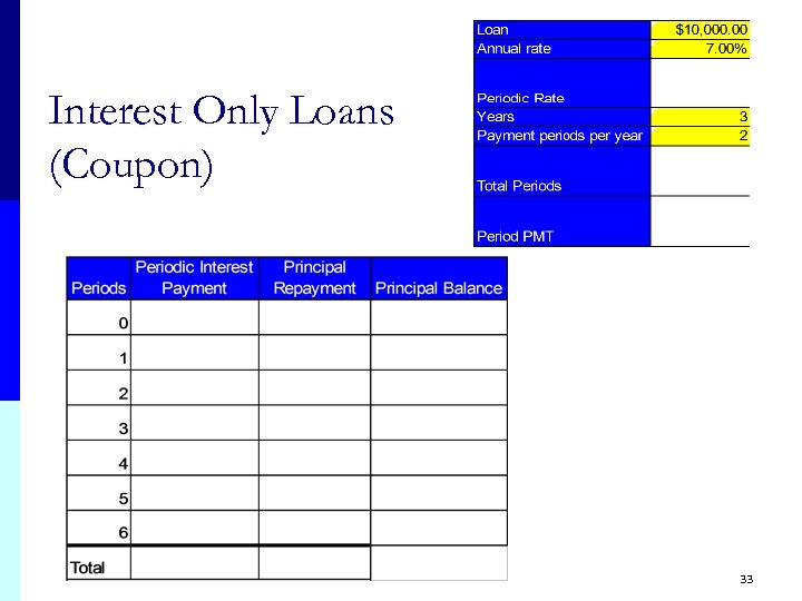 Interest Only Loans (Coupon) n Pay fixed interest amount each period n Principal* Periodic Rate Pay the principal back (all at once) at the end of the loan period (plus the last fixed interest amount) n Example: Bonds n 32