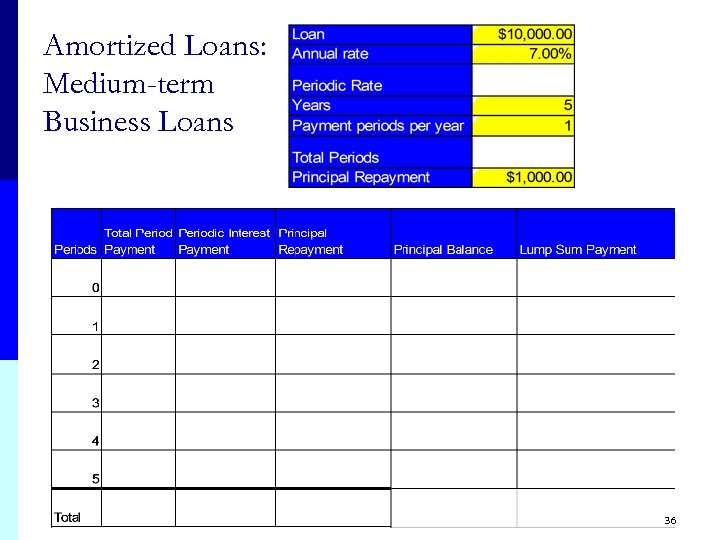 Amortized Loans - Medium-term Business Loans n Periodic Interest Amount: n Principal* Periodic Rate n Pay changing interest amount each period (amount gets smaller each period) n Principal amount paid: n n Fixed Amount Total Periodic payment gets smaller each period 35