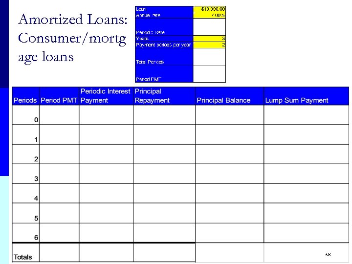 Amortized Loans - Consumer/mortgage loans & Effective Interest Rate Method for Bonds n Periodic Interest Amount: n n Principal amount paid: n n Principal* Periodic Rate n Pay changing interest amount each period (amount gets smaller each period) Periodic Payment - Periodic Interest Amount Total Periodic payment stays the same each period n Ordinary Annuity: Solve for PMT 37