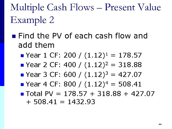 Multiple Cash Flows – Present Value Example 2 n Find the PV of each cash flow and add them Year 1 CF: 200 / (1. 12)1 = 178. 57 n Year 2 CF: 400 / (1. 12)2 = 318. 88 n Year 3 CF: 600 / (1. 12)3 = 427. 07 n Year 4 CF: 800 / (1. 12)4 = 508. 41 n Total PV = 178. 57 + 318. 88 + 427. 07 + 508. 41 = 1432. 93 n 44