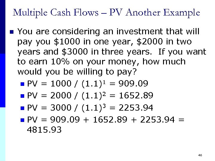 Multiple Cash Flows – PV Another Example n You are considering an investment that will pay you $1000 in one year, $2000 in two years and $3000 in three years. If you want to earn 10% on your money, how much would you be willing to pay? n PV = 1000 / (1. 1)1 = 909. 09 n PV = 2000 / (1. 1)2 = 1652. 89 n PV = 3000 / (1. 1)3 = 2253. 94 n PV = 909. 09 + 1652. 89 + 2253. 94 = 4815. 93 46