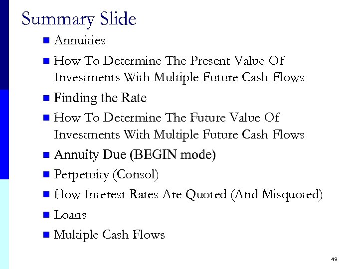 Summary Slide Annuities n How To Determine The Present Value Of Investments With Multiple Future Cash Flows n Finding the Rate n How To Determine The Future Value Of Investments With Multiple Future Cash Flows n Annuity Due (BEGIN mode) n Perpetuity (Consol) n How Interest Rates Are Quoted (And Misquoted) n Loans n Multiple Cash Flows n 49