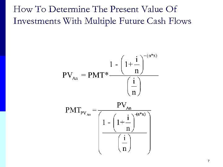 Annuities (Math) n All the cash flow associated with an annuity represent a geometric sequences n Geometric sequences: n A geometric sequence is one in which each successive term of the sequence is the same nonzero constant multiple of the preceding term § Constant multiple = (successive term)/(preceding term) n n Every two successive terms have a common ratio The total value of an annuity represents a finite geometric series n Geometric series: n The sum of the terms in a geometric sequence 6