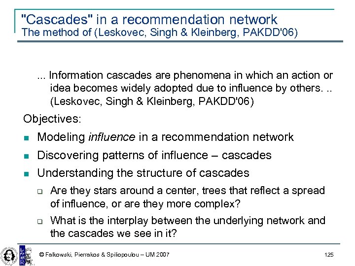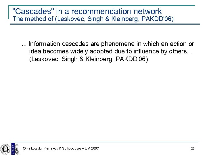 "Cascades" in a recommendation network The method of (Leskovec, Singh & Kleinberg, PAKDD'06) . . . Information cascades are phenomena in which an action or idea becomes widely adopted due to influence by others. . . (Leskovec, Singh & Kleinberg, PAKDD'06) © Falkowski, Pierrakos & Spiliopoulou – UM 2007 123