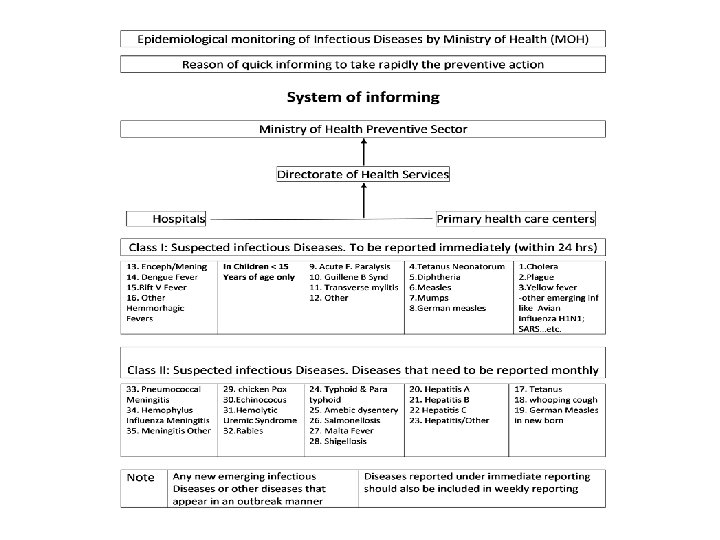 Reporting System in Saudi Arabia: - • Diseases under class 1 should be reported immediately from hospitals, to the responsible health care center to regional health affair directorate and eventually to the Ministry of Health by telephone, fax or most rapid means. • The diseases should be reported to the general directorate of preventive medicine by fax.