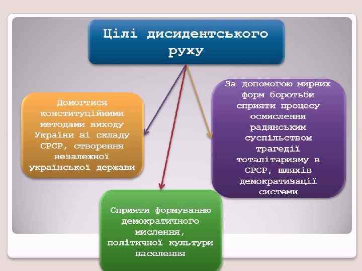 Дисидентство Виступ проти існуючого державного ладу чи загальноприйнятих норм певної країни, протистояння офіційній ідеології й політиці. Представники в Україні спочатку виступили проти: недоліків існуючої системи, ігнорування марксистсько-ленінських ідей, порушення законів, прав людини, свободи слова, совісті (віросповідання), друку, за вільний розвиток української мови і культури, за правду історії.