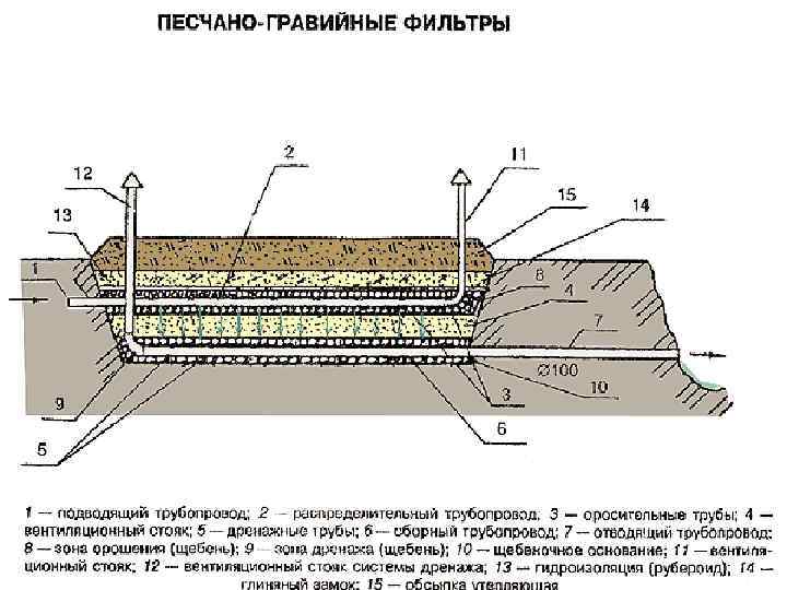Поле фильтрации В глинистых грунтах под площадкой со щебнем необходимо установить фильтрующий слой из песка, в котором проложены дренажные трубы. Сточные воды, пройдя слой песка, поступают в дренажные трубы и затем отводятся в канаву, или в технический колодец. Эти воды можно в дальнейшем использовать для полива.
