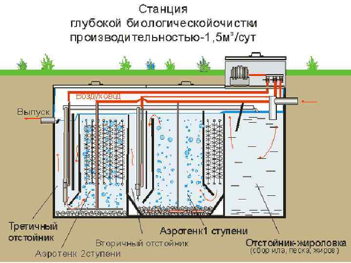 Устройство, в котором вода очищается, проходя через фильтр с бактериями. Иногда биофильтр находится в одной емкости с септиком, но в разных отсеках. Биофильтр состоит из фильтрующего наполнителя, спрятанного внутри емкости (фильтрующий наполнитель - это прослойка твердых, не гниющих частиц - мелких камушков, пенополиуретана, пенопласта и др. ). На поверхности частиц образуется биопленка - колонии микроорганизмов, поедающих органические вещества, растворенные в воде. В биофильтр вода поступает из отстойника дозированно (иначе большой напор может закрыть доступ кислорода к наполнителю биофильтра и погубить аэробные бактерии). Устройство канализационной системы <Осина>