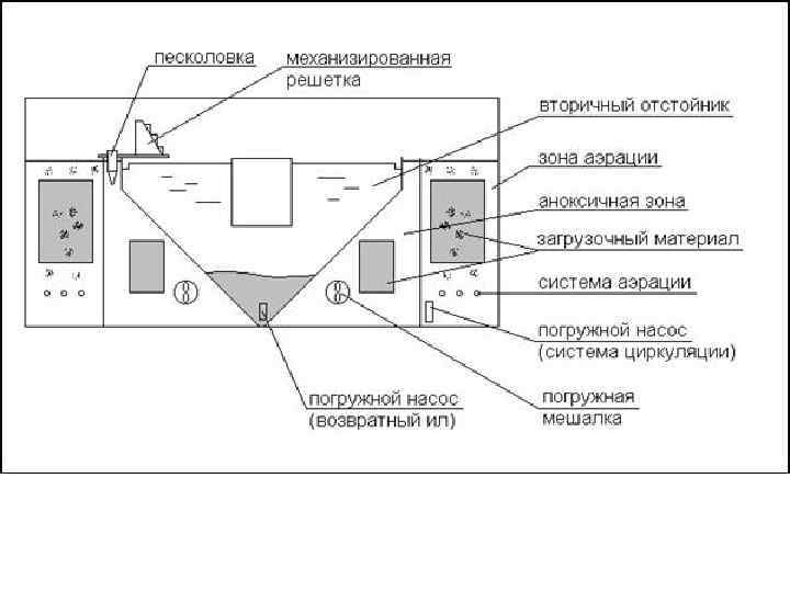 Далее иловая смесь поступает в аноксичную зону аэротенка, где также происходит изъятие и деструкция органических загрязнений, аммонификация азотсодержащих органических загрязнений факультативными микроорганизмами активного ила в присутствии связанного кислорода (кислорода нитритов и нитратов, образующихся на последующей стадии очистки) с одновременной денитрификацией. Далее иловая смесь направляется в аэробную зону аэротенка, где происходит окончательное окисление органических веществ и нитрификация азота аммонийного с образованием нитритов и нитратов. Процессы, протекающие в этой зоне, обуславливают необходимость интенсивной аэрации очищаемых сточных вод. Часть иловой смеси из аэробной зоны поступает во вторичные отстойники, а другая - вновь возвращается в аноксичную зону аэротенка для денитрификации окисленных форм азота. Эта схема в отличие от традиционных позволяет наряду с эффективным удалением соединений азота повысить эффективность изъятия соединений фосфора. За счет оптимального чередования аэробных и анаэробных условий при рециркуляции способность активного ила аккумулировать соединения фосфора возрастает в 5 -6 раз. Соответственно возрастает и эффективность его удаления с избыточным илом. Однако в случае повышенного содержания фосфатов в исходной воде, для удаления фосфатов до величины ниже 0, 5 -1, 0 мг/л, потребуется проведение обработки очищенной воды железо- или алюминий содержащим (например, оксихлорид алюминием) реагентом. Ввод реагента наиболее целесообразно производить перед сооружениями доочистки. Осветленная во вторичных отстойниках сточная вода направляется на доочистку, затем на обеззараживание и далее в водоем. Принципиальный вид комбинированного сооружения - аэротенка нитри-денитрификатора представлен на рис. 2.