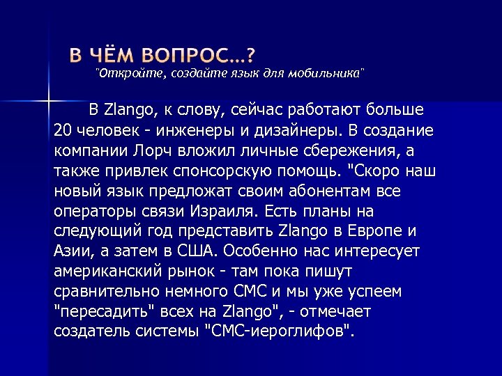 "Откройте, создайте язык для мобильника" В Zlango, к слову, сейчас работают больше 20 человек - инженеры и дизайнеры. В создание компании Лорч вложил личные сбережения, а также привлек спонсорскую помощь. "Скоро наш новый язык предложат своим абонентам все операторы связи Израиля. Есть планы на следующий год представить Zlango в Европе и Азии, а затем в США. Особенно нас интересует американский рынок - там пока пишут сравнительно немного СМС и мы уже успеем "пересадить" всех на Zlango", - отмечает создатель системы "СМС-иероглифов".