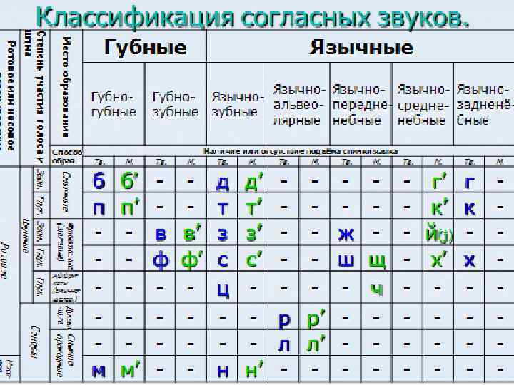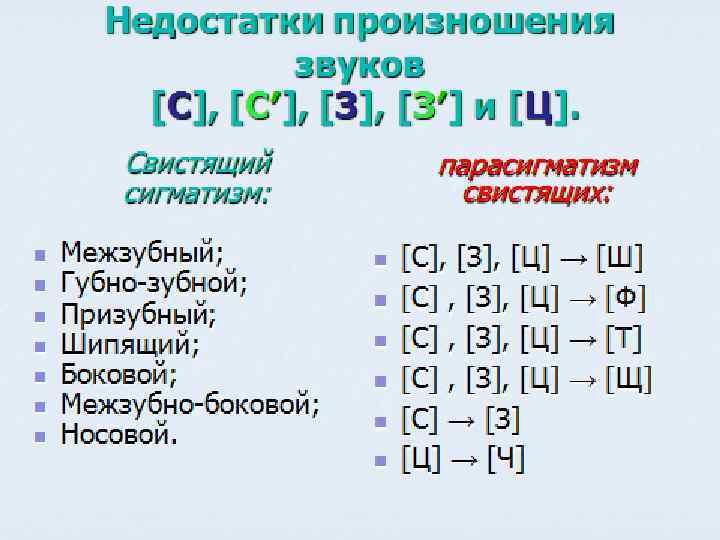 Проявление Наиболее частыми являются нарушения произношения свистящих и шипящих звуков (сигматизмы) или их затрудненное произношение (парасигматизмы). Среди них часто фонетические сигматизмы (межзубный, боковой, губно-зубной, щечный и т. п. ) и парасигматизмы (призубный, свистящий, шипящий и т. п. ). Нарушения произношения сонорных звуков р, рь, л, ль, представлены двумя группами, имеющими самостоятельные терминологические оформления. Нарушения произношения сонорных звуков л, ль, — ламбдаизм и параламбдацизм. Нарушения произношения сонорного звука «Р» (рь) — ротацизм и параротацизм. Нарушения произношения заднеязычных звуков г, гь, к, кь, х, хь — имеют самостоятельное название соответственно гаммацизм, каппацизм, хитизм. Некоторыми авторами они объединяются в одну группу «гаммацизм» или «готтентотизм» . Нарушение звука «й» носит название йотацизм.