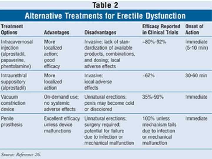 sildenafil (VIAGRA) Tadalafil (Cialis) Viagra is the most popular of the PDE 5 inhibitors administered orally in 10 mg and 20 mg doses Instructed to take Tadalafil two hours before sexual intercourse 25, 50 and 100 mg doses. Its efficacy is maintained for at least 36 hours Taken 1 hour before sexual intercourse The maximum dosing frequency is once every other day Maximum dose is once daily Window of opportunity: 30 minutes to 45 hrs But can be effective for up to 12 hrs side effects, such as: headache, facial flushing, dyspepsia, dizziness, rhinitis and abnormal vision C/I: after AMI Improved erections were reported by 82. 8% of treated men. Thirty six hours after administration of Tadalafil, 59. 2% of intercourse attempts were successful Side effects: headache, flushing, rhinitis and back pain/myalagia Safety concern: it also serves as an inhibitor of PDE 11, an enzyme in the testes, so there is concern on the effect that it has one sperm and spermatogenesis