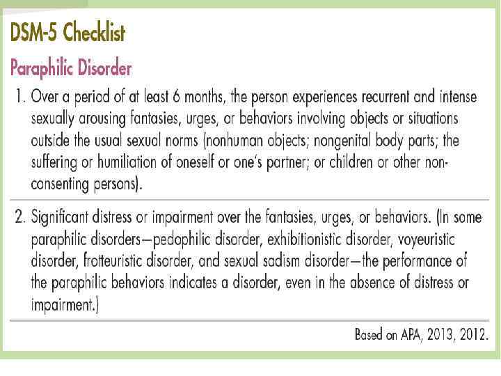 Paraphilias These disorders are characterized by intense sexual urges, fantasies or behaviors that involve: Nonhumans Children Nonconsenting adults The experience of suffering or humiliation According to the DSM-5, paraphilias should be diagnosed only when the urges, fantasies, or behaviors last at least 6 months For most paraphilias, the urges, fantasies, or behaviors must also cause great distress or interfere with one's functioning Some people with one kind of paraphilia display others as well Relatively few people receive a formal diagnosis, but clinicians suspect that the patterns may be quite common