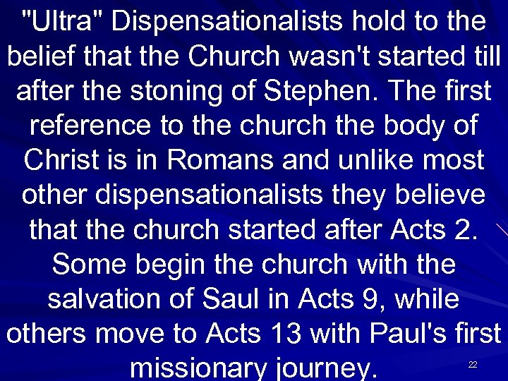 "Ultra" Dispensationalists hold to the belief that the Church wasn't started till after the stoning of Stephen. The first reference to the church the body of Christ is in Romans and unlike most other dispensationalists they believe that the church started after Acts 2. Some begin the church with the salvation of Saul in Acts 9, while others move to Acts 13 with Paul's first missionary journey. 22