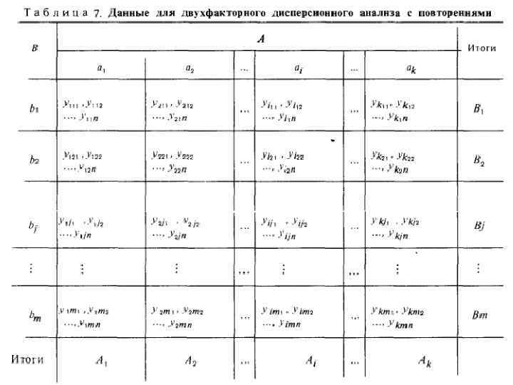 Введем следующие обозначения: Величины и можно считать выборочными дисперсиями с (к-1) и (m-1) степенями свободы соответственно. Проверяют нулевые гипотезы о незначимости влияния факторов А и В по критерию Фишера. Нулевая гипотеза значима, αi=0.