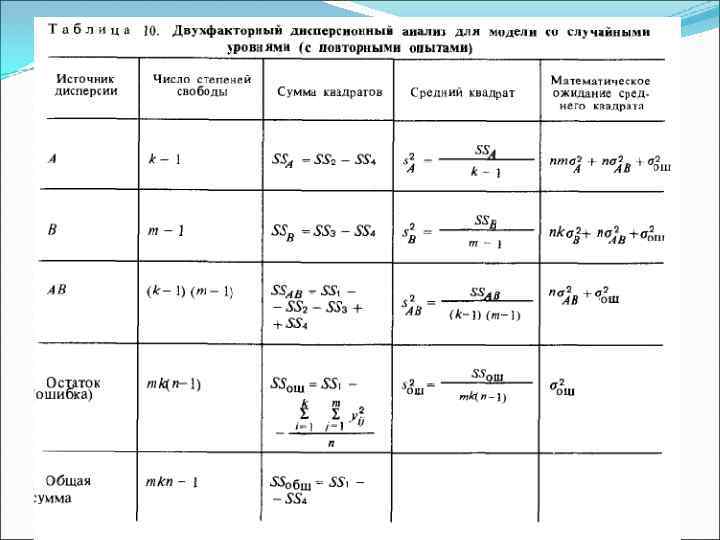 Рассмотрим модель со взаимодействием факторов А и В. Пусть при каждом сочетании уровней факторов А и В проводится n параллельный опытов. Имеется целая серия наблюдений yij 1, yij 2, …, yijn. Выборочная дисперсия результатов в каждой ячейке, где (n-1)-степень свободы: Если выборочные дисперсии по всем ячейкам однородны, их можно усреднить и использовать полученную средневзвешенную дисперсию в качестве оценки для дисперсии воспроизводимости σ2 : Число степеней свободы равно mk(n-1)