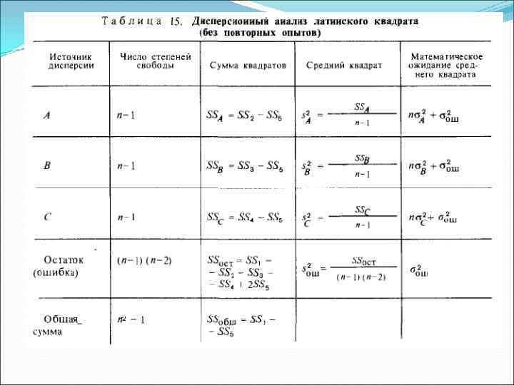 5)Сумму квадратов итогов по латинским буквам , деленную на число наблюдений, соответствующих каждой букве 6) Квадрат общего итога, деленный на число всех наблюдений(корректирующий член) 10) Общую сумму квадратов, равную разнице между суммой квадратов всех наблюдений и корректирующим членом