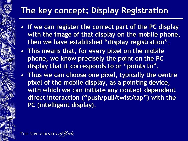 The key concept: Display Registration • If we can register the correct part of the PC display with the image of that display on the mobile phone, then we have established “display registration”. • This means that, for every pixel on the mobile phone, we know precisely the point on the PC display that it corresponds to or “points to”. • Thus we can choose one pixel, typically the centre pixel of the mobile display, as a pointing device, with which we can initiate any context dependent direct interaction (“push/pull/twist/tap”) with the PC (intelligent display).