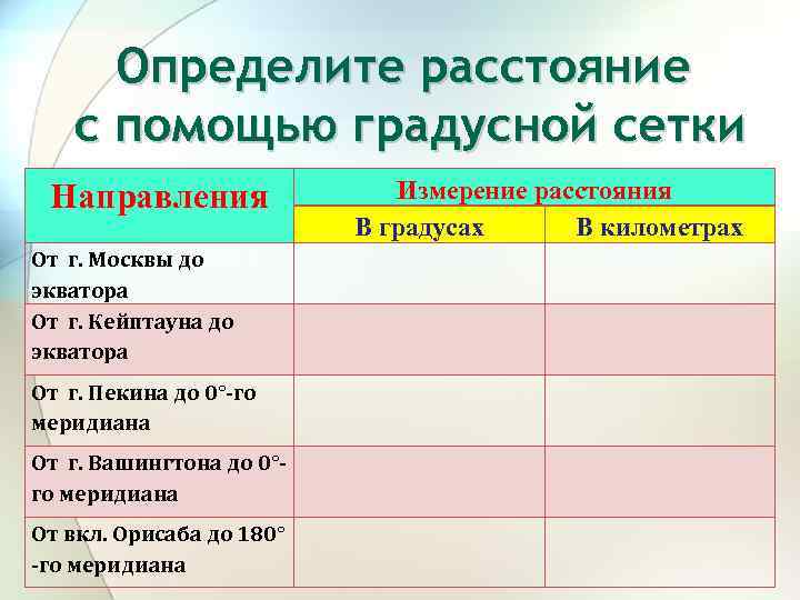Определите расстояние с помощью градусной сетки Измерение расстояния В градусах В километрах Направления От г. Москвы до экватора От г. Кейптауна до экватора От г. Пекина до 0°-го меридиана От г. Вашингтона до 0°- го меридиана От вкл. Орисаба до 180° -го меридиана