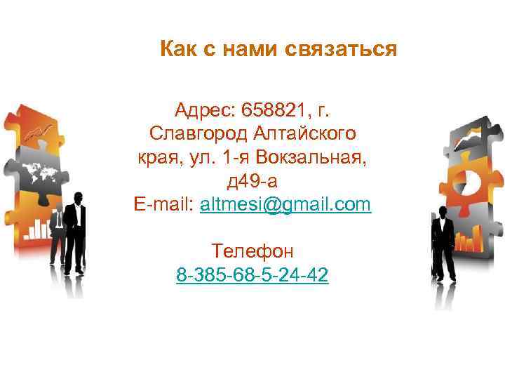 Как с нами связаться Адрес: 658821, г. Славгород Алтайского края, ул. 1 -я Вокзальная, д 49 -а E-mail: altmesi@gmail. com Телефон 8 -385 -68 -5 -24 -42