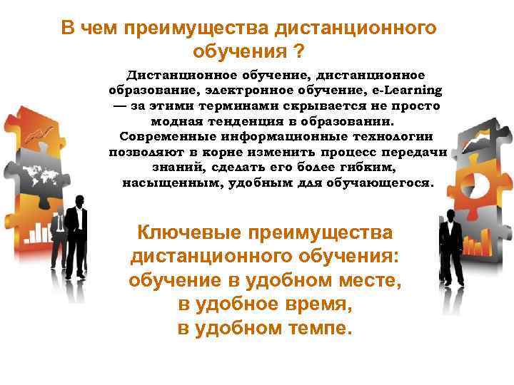 В чем преимущества дистанционного обучения ? Дистанционное обучение, дистанционное образование, электронное обучение, e-Learning — за этими терминами скрывается не просто модная тенденция в образовании. Современные информационные технологии позволяют в корне изменить процесс передачи знаний, сделать его более гибким, насыщенным, удобным для обучающегося. Ключевые преимущества дистанционного обучения: обучение в удобном месте, в удобное время, в удобном темпе.