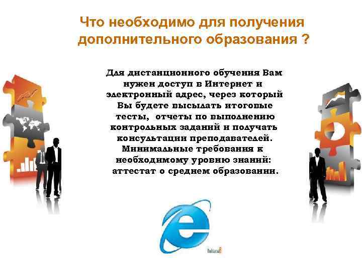 Что необходимо для получения дополнительного образования ? Для дистанционного обучения Вам нужен доступ в Интернет и электронный адрес, через который Вы будете высылать итоговые тесты, отчеты по выполнению контрольных заданий и получать консультации преподавателей. Минимальные требования к необходимому уровню знаний: аттестат о среднем образовании.