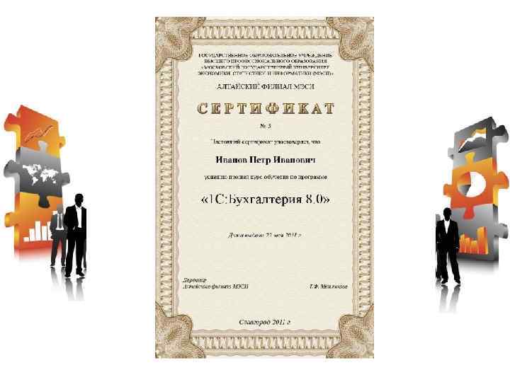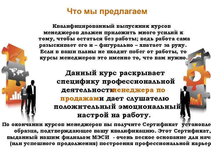 Что мы предлагаем Квалифицированный выпускник курсов менеджеров должен приложить много усилий к тому, чтобы остаться без работы; ведь работа сама разыскивает его и – фигурально – хватает за руку. Если в ваши планы не входит побег от работы, то курсы менеджеров это именно то, что вам нужно. Данный курс раскрывает специфику профессиональной деятельности менеджера по продажами дает слушателю положительный эмоциональный настрой на работу. По окончании курсов менеджеров вы получите Сертификат установлен образца, подтверждающее вашу квалификацию. Этот Сертификат, выданный нашим филиалом МЭСИ - очень веское основание для нача (или успешного продолжения) построения профессиональной карьер