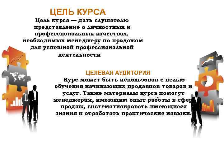 ЦЕЛЬ КУРСА Цель курса — дать слушателю представление о личностных и профессиональных качествах, необходимых менеджеру по продажам для успешной профессиональной деятельности. ЦЕЛЕВАЯ АУДИТОРИЯ Курс может быть использован с целью обучения начинающих продавцов товаров и услуг. Также материалы курса помогут менеджерам, имеющим опыт работы в сфере продаж, систематизировать имеющиеся знания и отработать практические навыки.