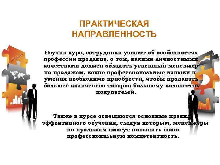 ПРАКТИЧЕСКАЯ НАПРАВЛЕННОСТЬ Изучив курс, сотрудники узнают об особенностях профессии продавца, о том, какими личностными качествами должен обладать успешный менеджер по продажам, какие профессиональные навыки и умения необходимо приобрести, чтобы продавать большее количество товаров большему количеству покупателей. Также в курсе освещаются основные правила эффективного обучения, следуя которым, менеджеры по продажам смогут повысить свою профессиональную компетентность.