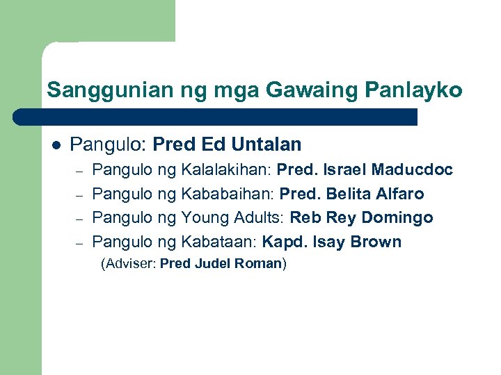 Sanggunian ng mga Gawaing Panlayko l Pangulo: Pred Ed Untalan – – Pangulo ng Kalalakihan: Pred. Israel Maducdoc Pangulo ng Kababaihan: Pred. Belita Alfaro Pangulo ng Young Adults: Reb Rey Domingo Pangulo ng Kabataan: Kapd. Isay Brown (Adviser: Pred Judel Roman)