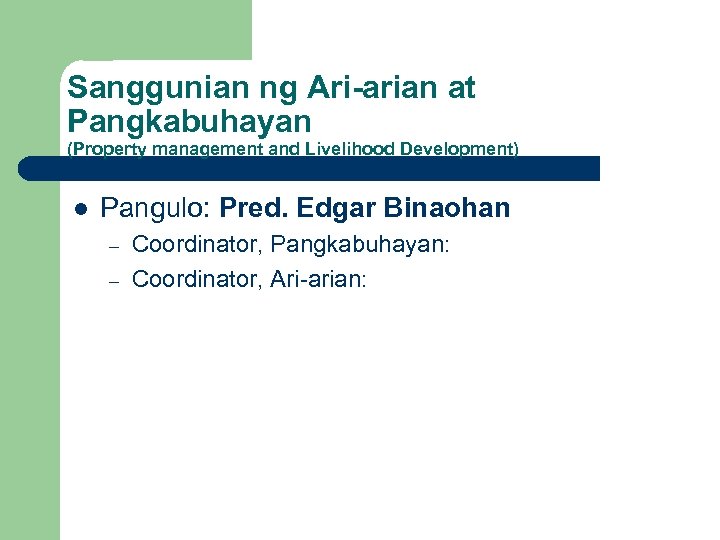 Sanggunian ng Ari-arian at Pangkabuhayan (Property management and Livelihood Development) l Pangulo: Pred. Edgar Binaohan – – Coordinator, Pangkabuhayan: Coordinator, Ari-arian: