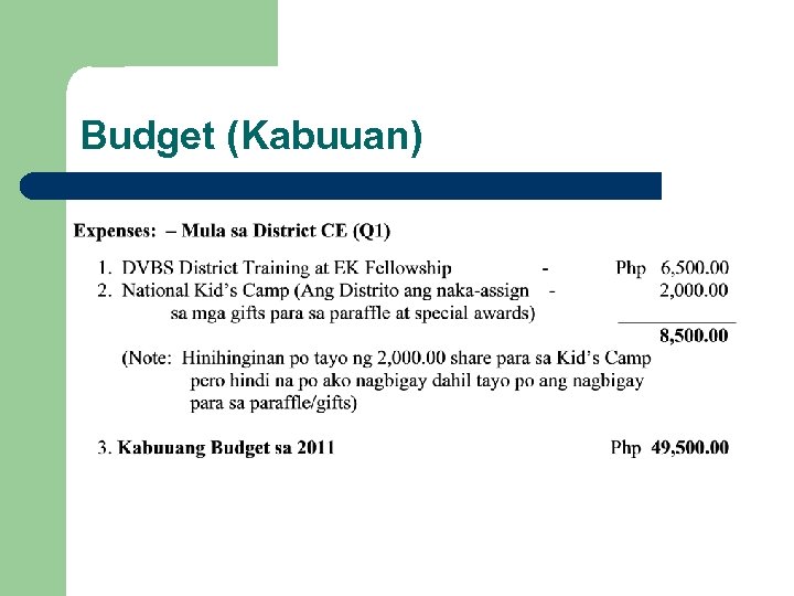 Mga Tagubilin Mapag-ukulan ng pag-aaral at pag-aayos ang mga benepisyo ng District Workers ng pangasiwaan ng Distrito at iharap ang nasabing panukala sa pamunuan ng Distrito at sa susunod na pulong ng Distrito. 1. - District full-time workers - Coordinators 2. Makapag-laan ng Pondo ang Sangunian sa pagsasakatuparan ng mga gawaing nito. Estimate Monthly Operational Fund (Limit: P 1, 500 with ORs)