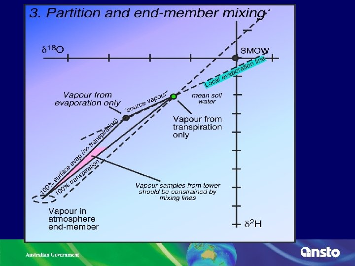 Expected isotope ratios for SE Australia (Tumbarumba) L rainwater M G W Surface water Root zone water = stem water = transpired water Surface evaporate L LE Local vapour 9 -10 ‰ Leaves