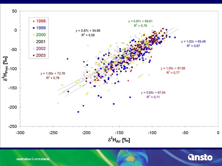 Munich; vapour/precipitation equilibrium Regression; r 2 = 0. 7 Delta 18 O(p-v) = 8. 5 ‰ data source: W. Stichler, unpublished